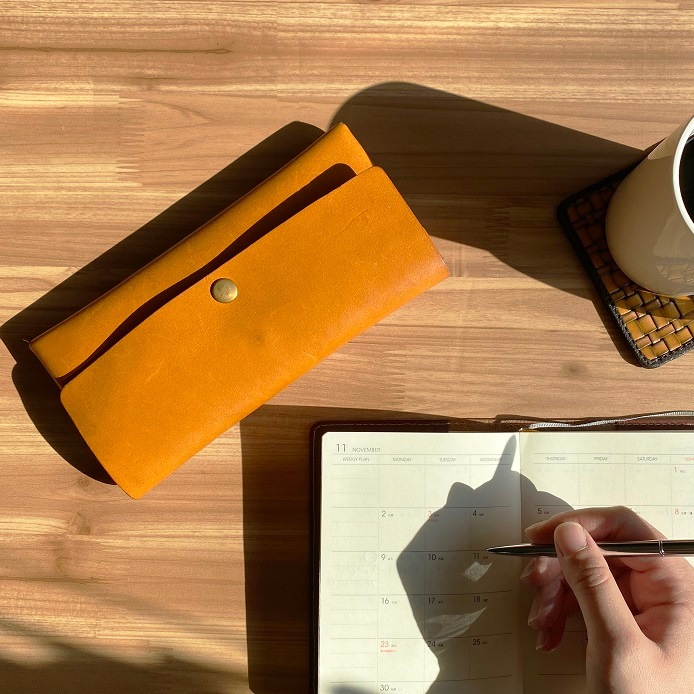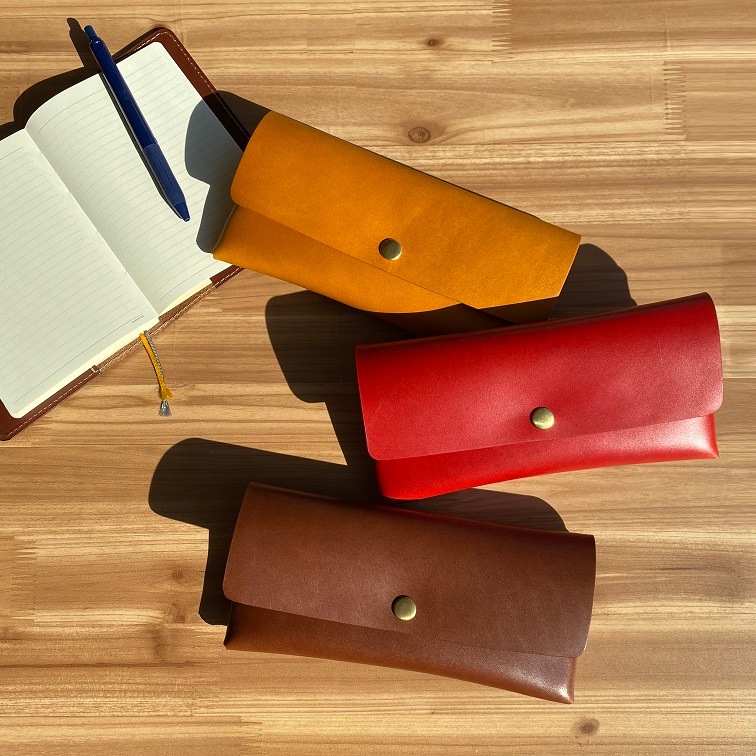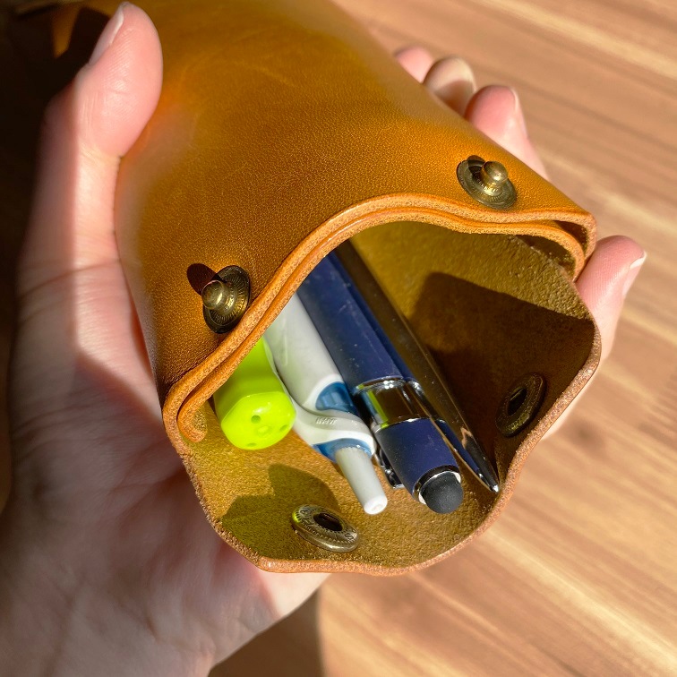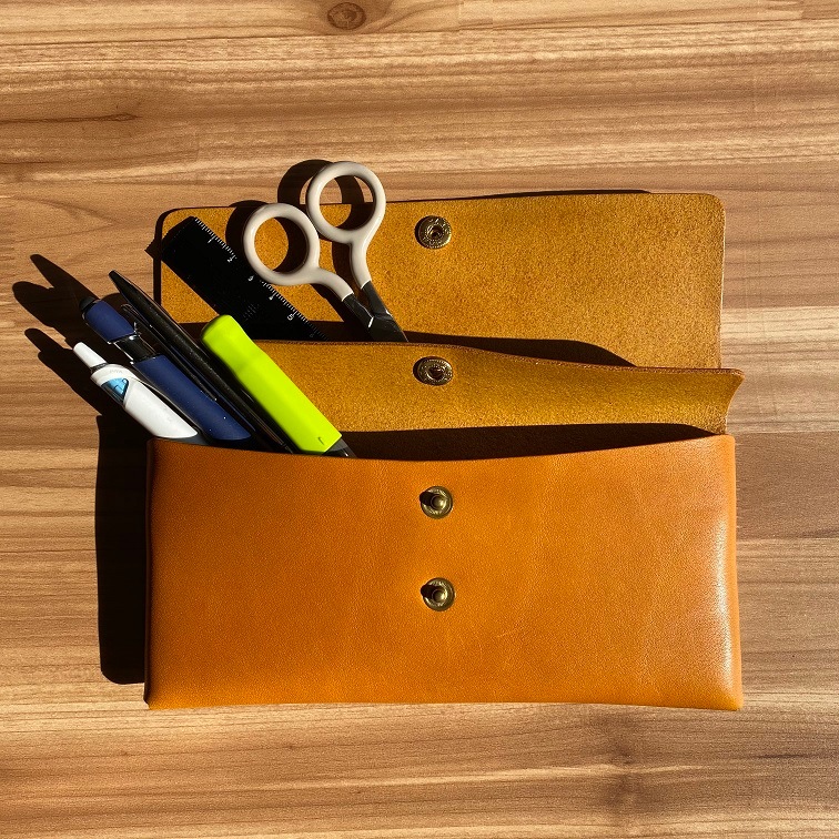 - 栃木レザーのヌメ革を使用したホックケース。ペンケースにも、お財布としてもご使用いただけます。中にもホックがついており、物を分けて入れる事ができます。また、両側にも取り出しに便利なホック付き。使用している栃木レザーのヌメ革(フルベジタブルタンニンレザー)は、しなやかさと丈夫さを持ちあわせており、使い込むほどに独特の色や味わいに変化していきます。持つ人のライフスタイルに合わせて変化していくその味わい深さにきっと、何とも言えない愛着が湧いてくるはず。色は、ナチュラルでかわいいパンプキン・トマト・マロンの3色をご用意致しました。