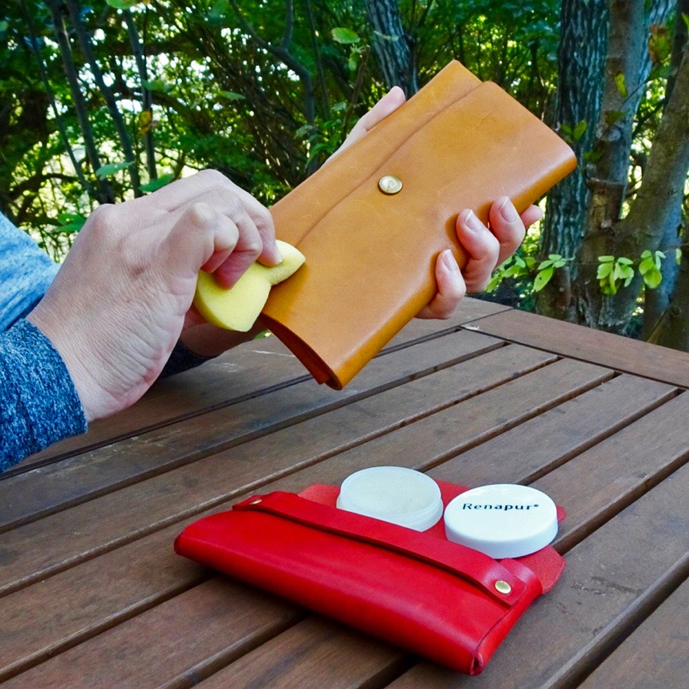 - ドイツ生まれの天然素材100%のレザーケアー用トリートメントです。主に蜜ろう(蜜蜂の分泌物)とホホバ(ツゲ科の植物)油を配合しており、強いにおいもなく安心してご使用して頂けます。付属のスポンジで薄く伸ばすだけで十分な効果を発揮します。一日ほど乾かして重ね塗りをすれば多少の撥水効果も高まります。