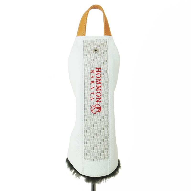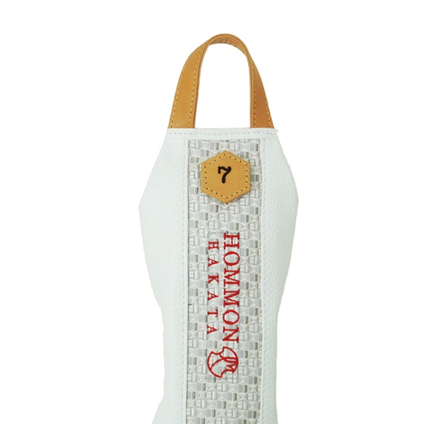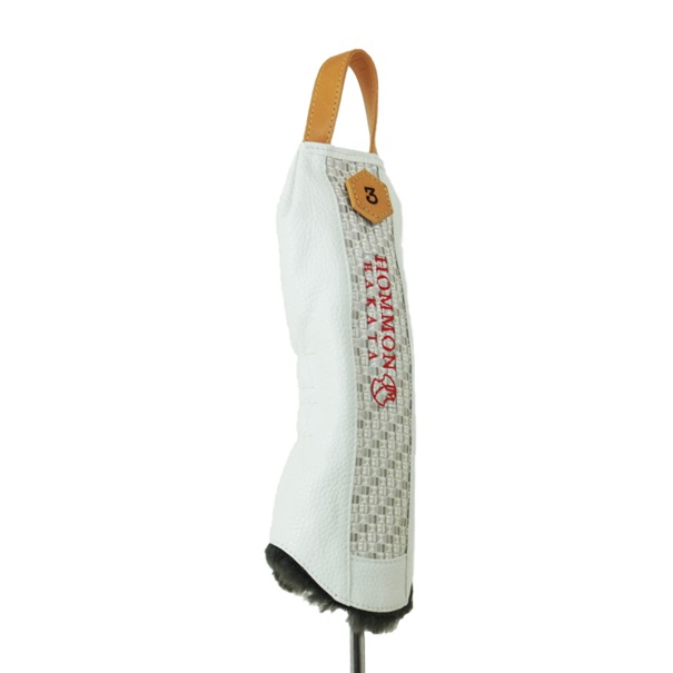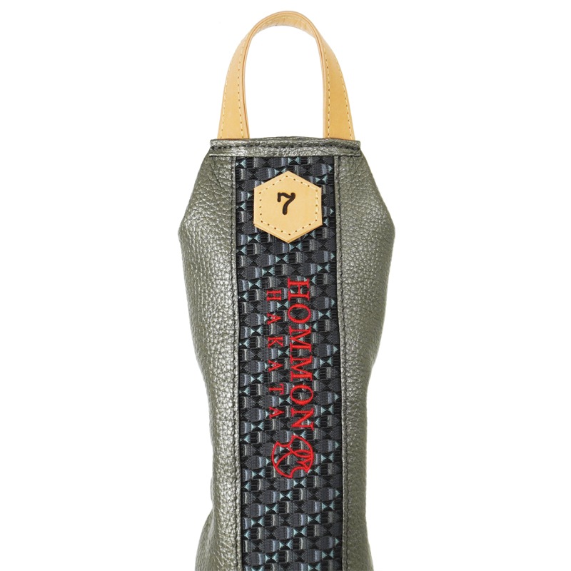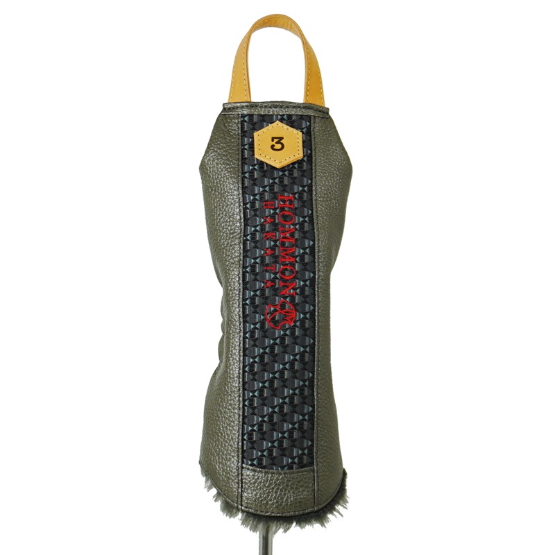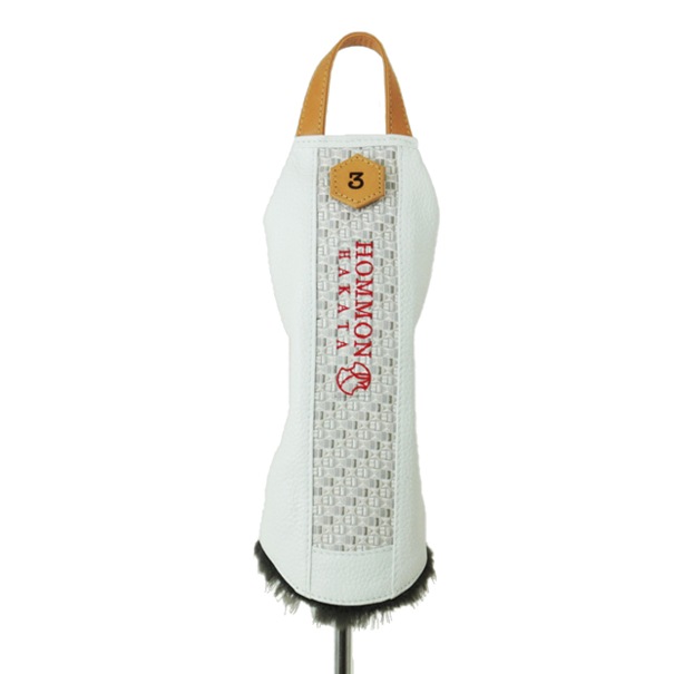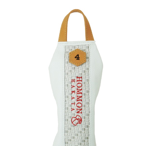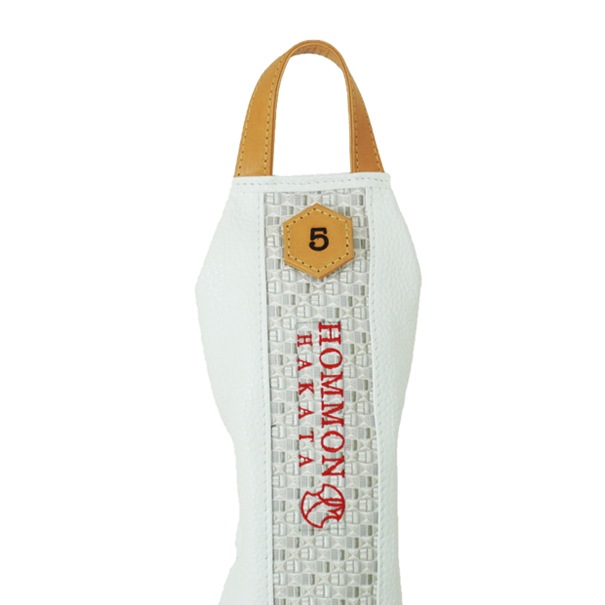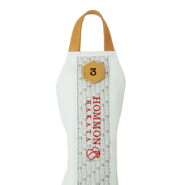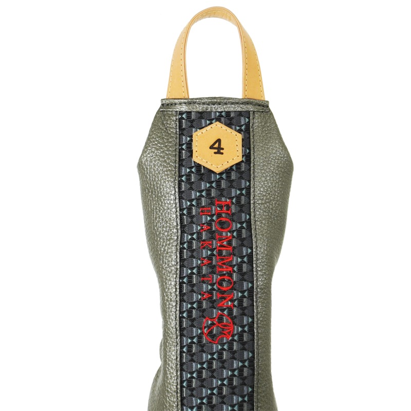 HOMMON HAKATA GOLFから博多の伝統工芸である博多織とレザーのコラボレーションアイテム、ドライバーのヘッドカバーが新登場。糸からこだわり、HOMMON HAKATAオリジナルカラーで織っていただきました。織元は昭和48年創業の大倉織物様です。大倉織物様の『琥珀織』は薩摩切子をモチーフにされており、通常より高密度かつ太めの糸で織られた『琥珀織』は表面の立体感が特徴的となっております。立体的に表現された折柄は、贅沢で煌びやかな高級感のある光沢感を見せてくれます。中はふわふわボア付きでギアをプロテクト。持ち手はイタリアンレザーのヌメ革を使用し、着脱しやすいデザインにしました。長年使用していけば、ヌメ革独特の飴色に変化していきます。(変化は使用条件によって異なります。)ウッドナンバー『3・4・5・7・X』よりお選びください。