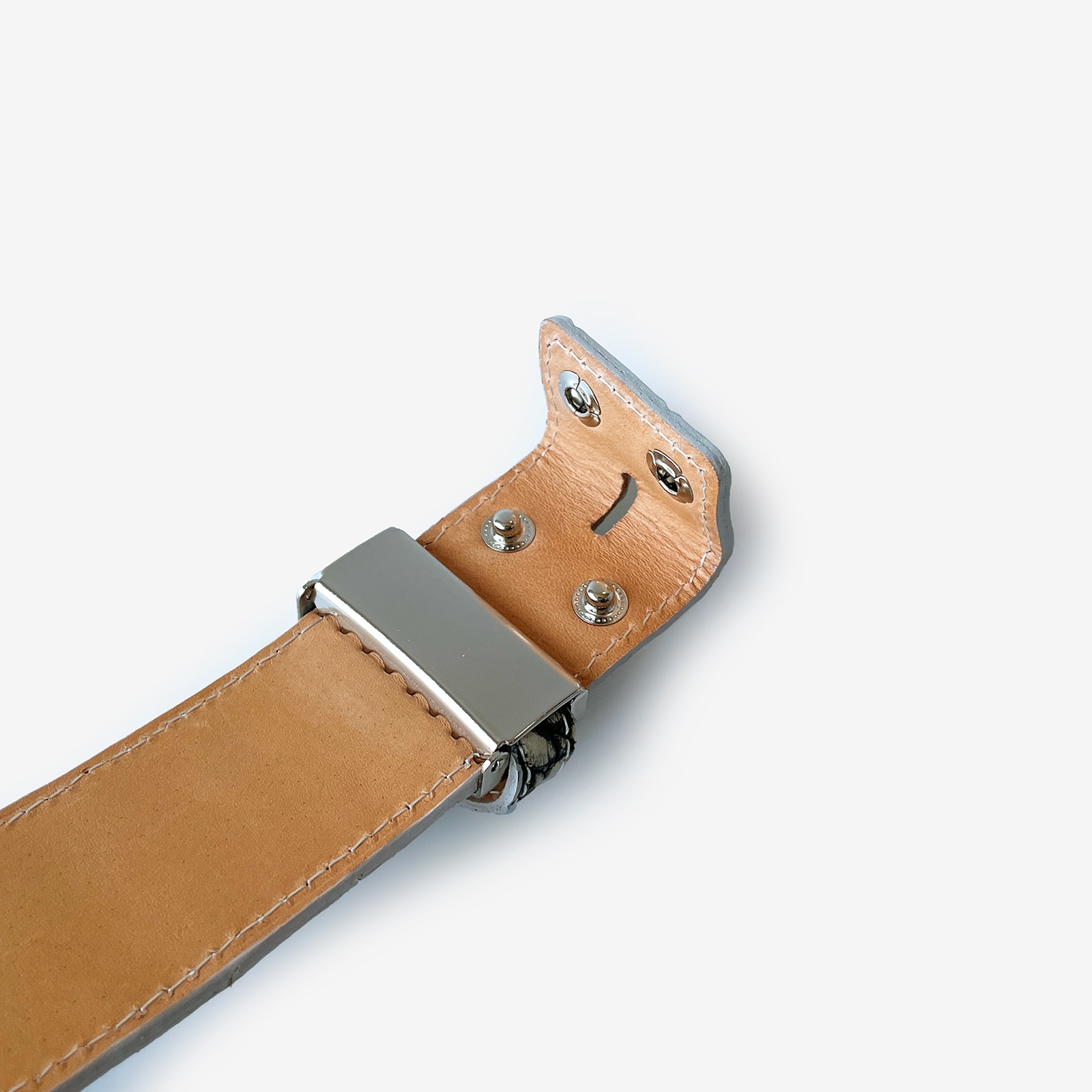 - クロコダイル(ワニ革)のレザーベルトストラップ。皮革の宝石とも例えられる最高級皮革のクロコダイルを贅沢に使った、パッチワークのデザインが特徴的です。艶を抑えたマット仕上げが、フォーマルにもカジュアルにも高級感を演出させます。
