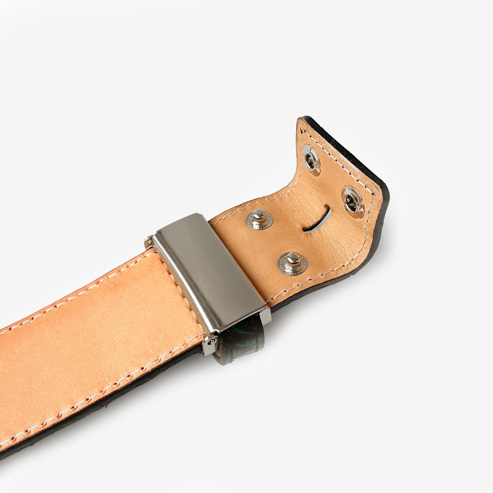 - クロコダイル(ワニ革)のレザーベルトストラップ。皮革の宝石とも例えられる最高級皮革のクロコダイルを贅沢に使った、パッチワークのデザインが特徴的です。